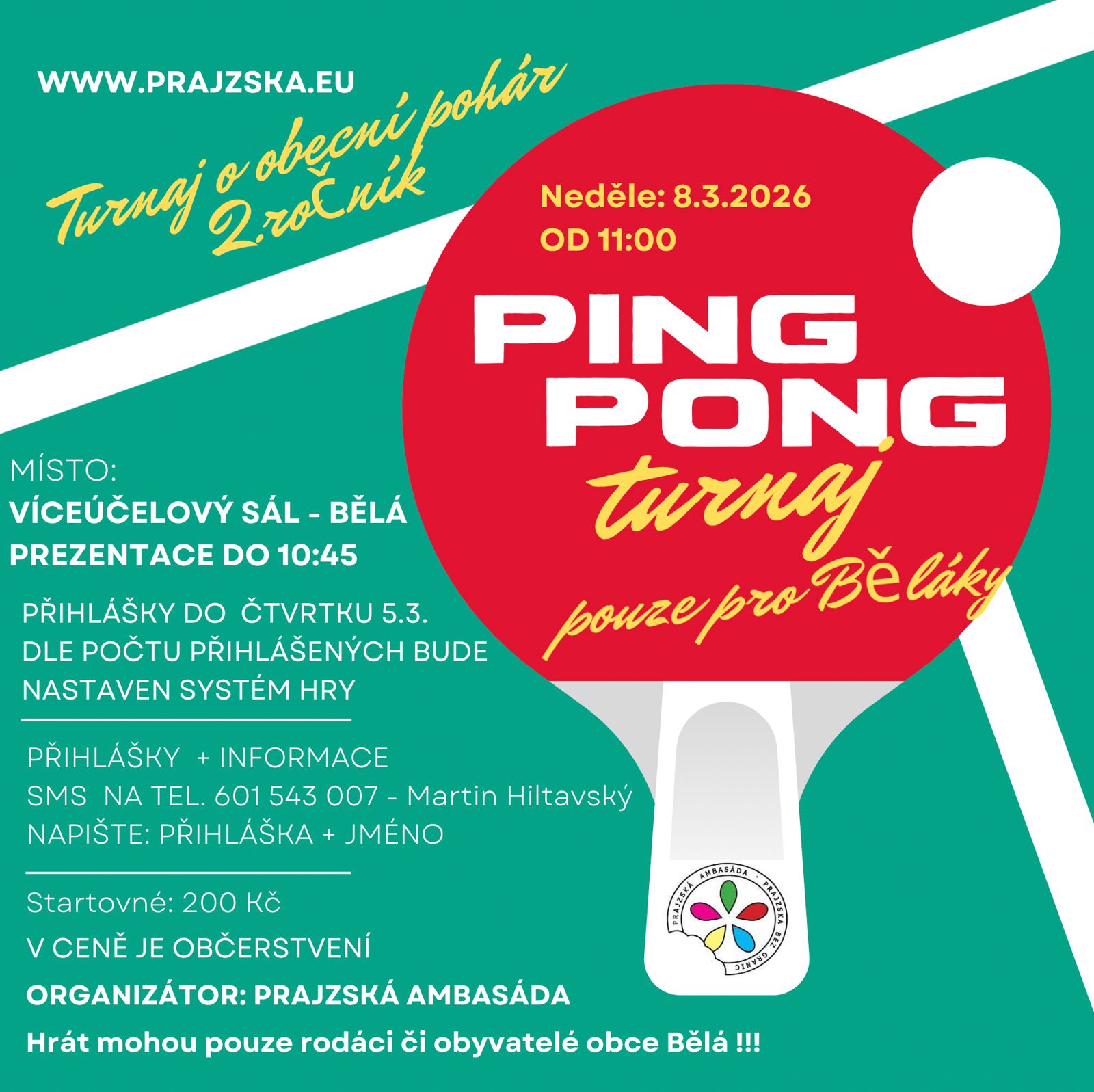 Přijďte se v neděli 8.3.2026 zúčastnit turnaje v Ping Pongu.